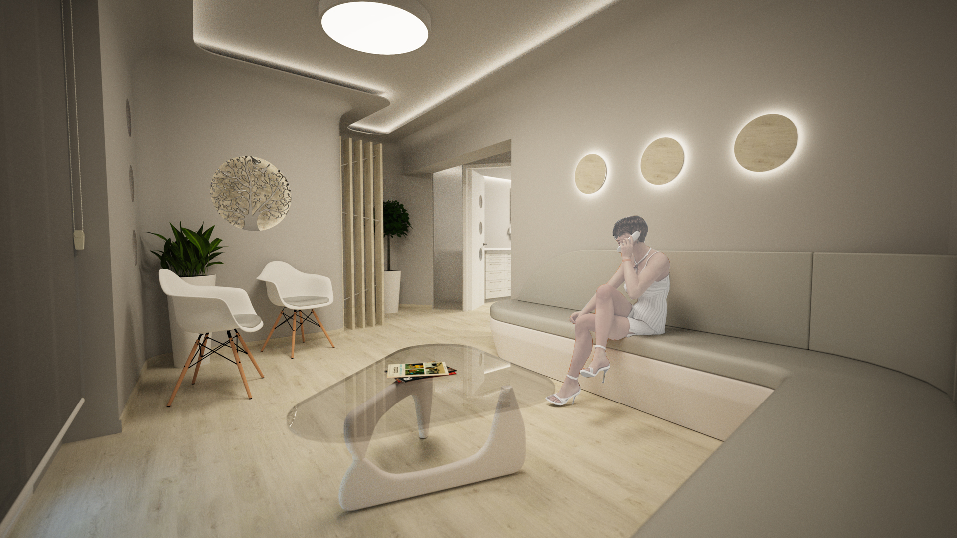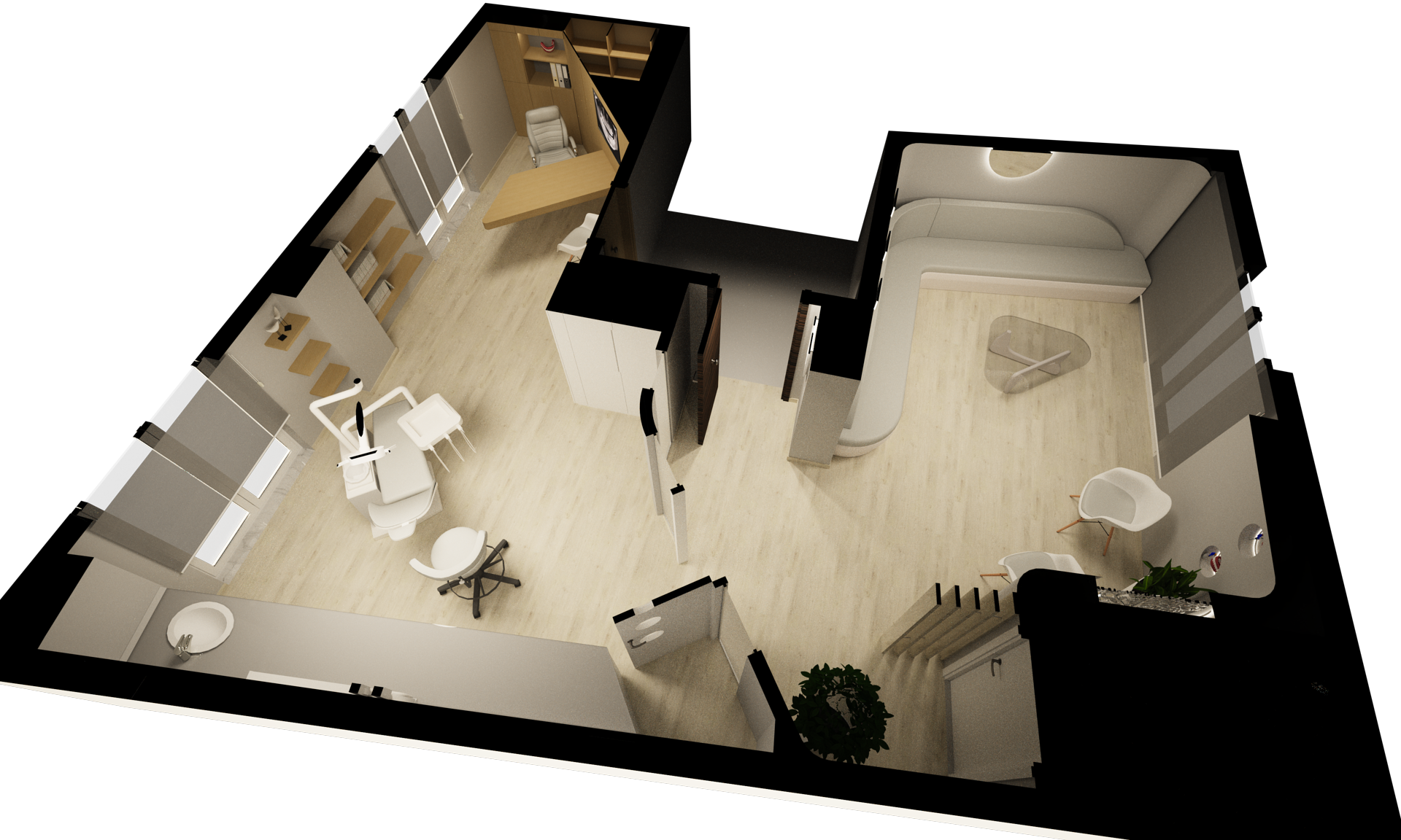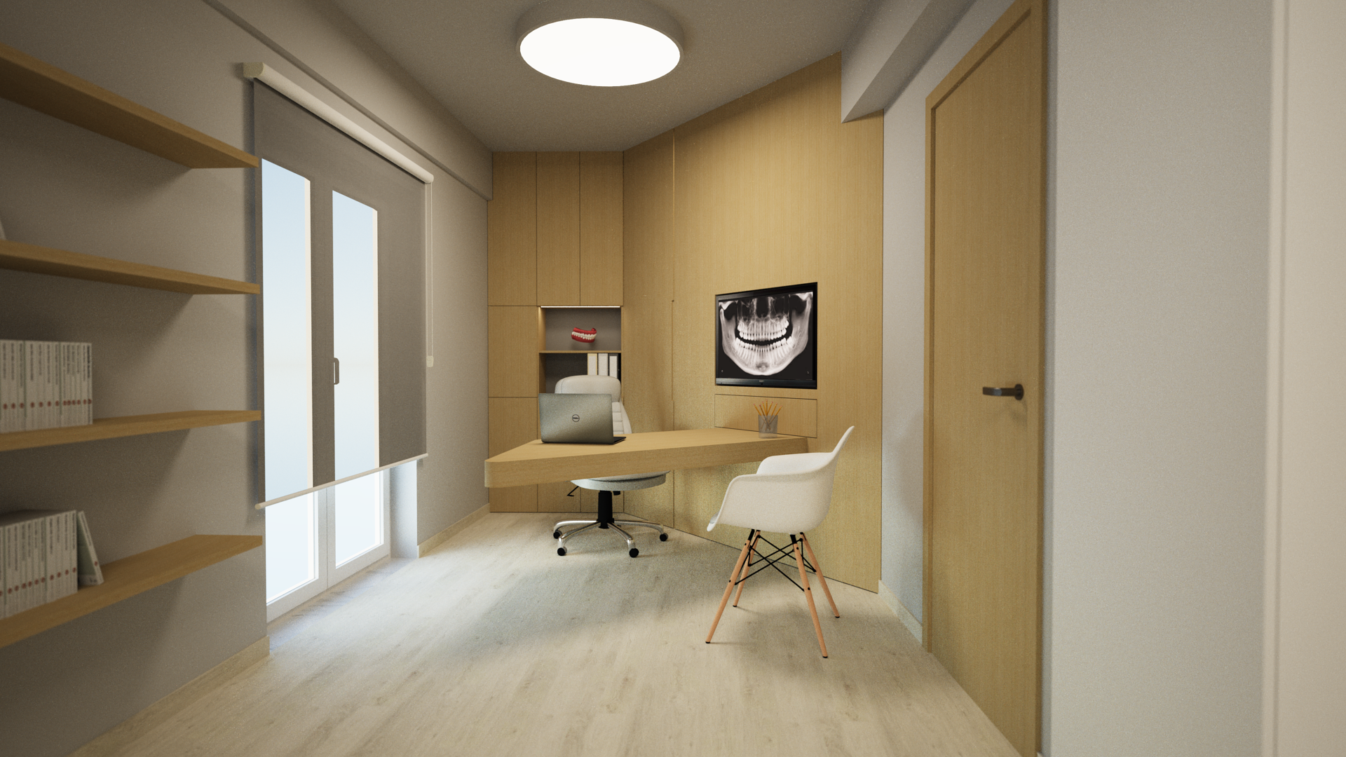 Η μελέτη αφορά στην ανακαίνιση υφιστάμενου οδοντιατρείου προκειμένου ο χώρος να αποκτήσει μεγαλύτερο χώρο αναμονής και διαμορφωμένο χώρο εισόδου ανάμεσα στο ιατρείο και το καθιστικό. Ο χώρος του ιατρείου διαμορφώνεται με μία οδοντιατρική έδρα και πάγκο εργαστηρίου σε άμεση γειτνίαση με αυτή, ενώ στο βάθος οργανώνεται ο χώρος του γραφείου με κρυφό αποθηκευτικό χώρο για τα αρχεία των ασθενών. Η μελέτη περιλαμβάνει τον σχεδιασμό custom-made επίπλων για την καλύτερη λειτουργία και εξοικονόμηση χώρου.